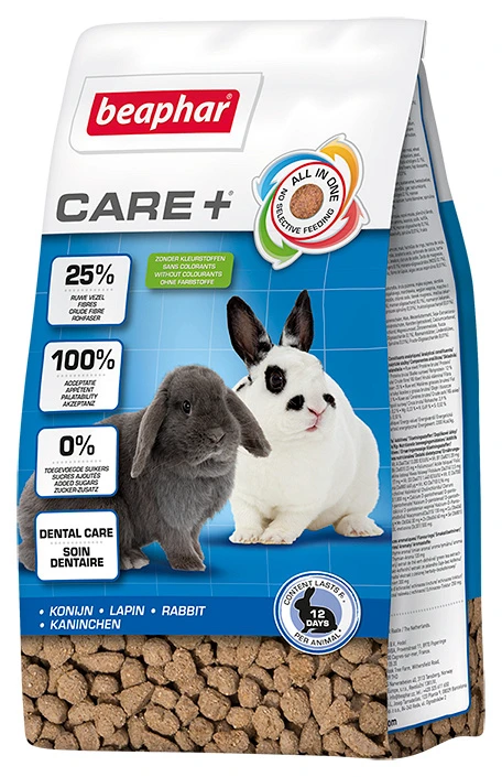 Care+ Konijn is een zeer smaakvolle en uitgebalanceerde voeding . Het is ontwikkeld in samenwerking met dierenartsen en voedingsdeskundigen. Care+ is geëxtrudeerd, deze hittebehandeling maakt een betere vertering van eiwitten uit het voer mogelijk en maakt de brokjes extra krokant. De ingrediënten zijn afgestemd op de voedingsbehoefte en benaderen het natuurlijke voedingspatroon. Ieder brokje heeft dezelfde samenstelling (All-in-One), met als resultaat: geen selectief eetgedrag, dus geen restjes en geen tekort aan essentiële voedingsstoffen. De harde brokjes ondersteunen de natuurlijke slijtage van de tanden (Dental Function). De brokjes bevatten verder een uitgebalanceerde verhouding van de meervoudig onverzadigde vetzuren Omega-3 & Omega 6 (uit maïs, tarwe, soja en vlaszaad), vitamine E voor de lichaamscellen, het juiste ruwvezelgehalte en smakelijke kruiden. Met Care+ heeft u absoluut het beste voor uw konijn in handen. • ieder brokje heeft dezelfde samenstelling • geen selectief eetgedrag • natuurlijke slijtage tanden Voedingsadvies: Care+ wordt direct geaccepteerd. Het is echter zeer belangrijk om geleidelijk naar een nieuw voer over te schakelen. De eerste dagen kunt u Care+ dan ook het beste mengen met het oude voer. De aanbevolen hoeveelheid Care+ per dag is afhankelijk van de grootte en het gewicht van uw konijn: Klein/Mini Pooltje & Nederlandse Dwerg ca. 60g, Nederlandse Dwerghangoor ca. 85g, Rex ca. 115g, Franse hangoor, Vlaamse Reus & Belgische Haas 170-450g, Engelse Reus 340-450g bij voorkeur te verdelen over 2 voedingen. Geef iedere dag schoon en fris drinkwater en zorg ervoor dat het konijn onbeperkt hooi ter beschikking heeft!