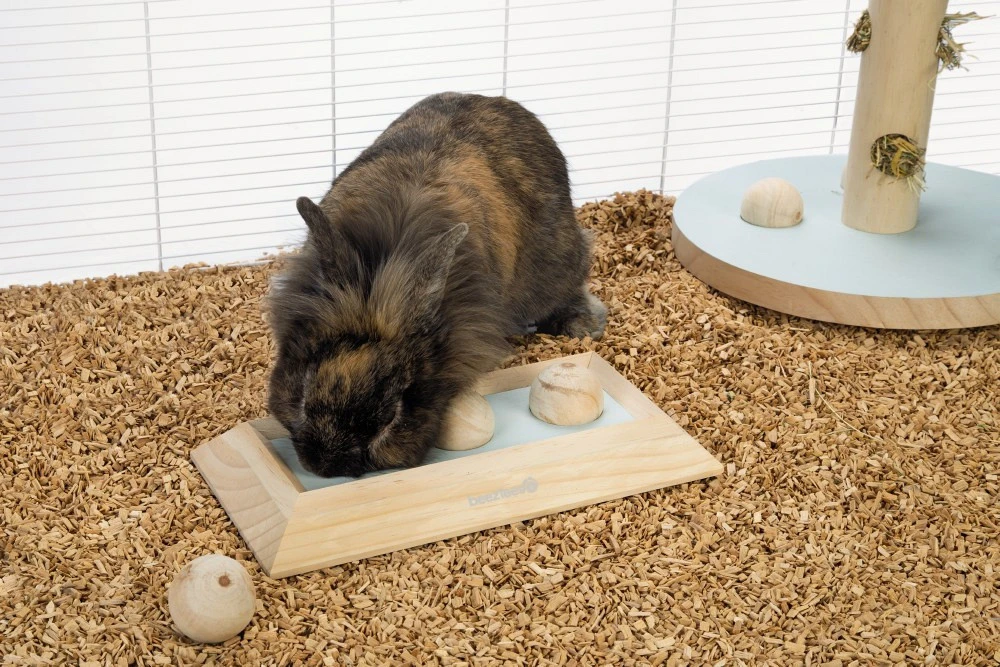 De Beeztees braingame Ballira is een houten verstop- en traktatiespel om het natuurlijke gedrag van het knaagdier of konijn te stimuleren.