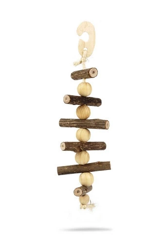 Dit houten vogelspeeltje genaamd klimbo bestaat uit onbewerkt hout en is niet schadelijk. Voor veel speelplezier. U kunt dit speeltje ophangen in elke vogelkooi.