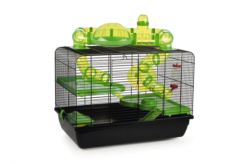 Een moderne knaagdierenkooi genaamd Galaxy. Deze kooi valt op door zijn strakke moderne uiterlijk. Inclusief platform, looprad, fel groen transparant buizensysteem, drinkflesje en voederbakje. Ook wordt er een spacestation meegeleverd die u eventueel tussen de buizen kunt plaatsen. Dit station dient ervoor dat uw knaagdier heerlijk kan gaan liggen slapen. Kleur tralies: zwart. Kleur onderbak: zwart. Afmetingen: 58 x 38 x 43 cm