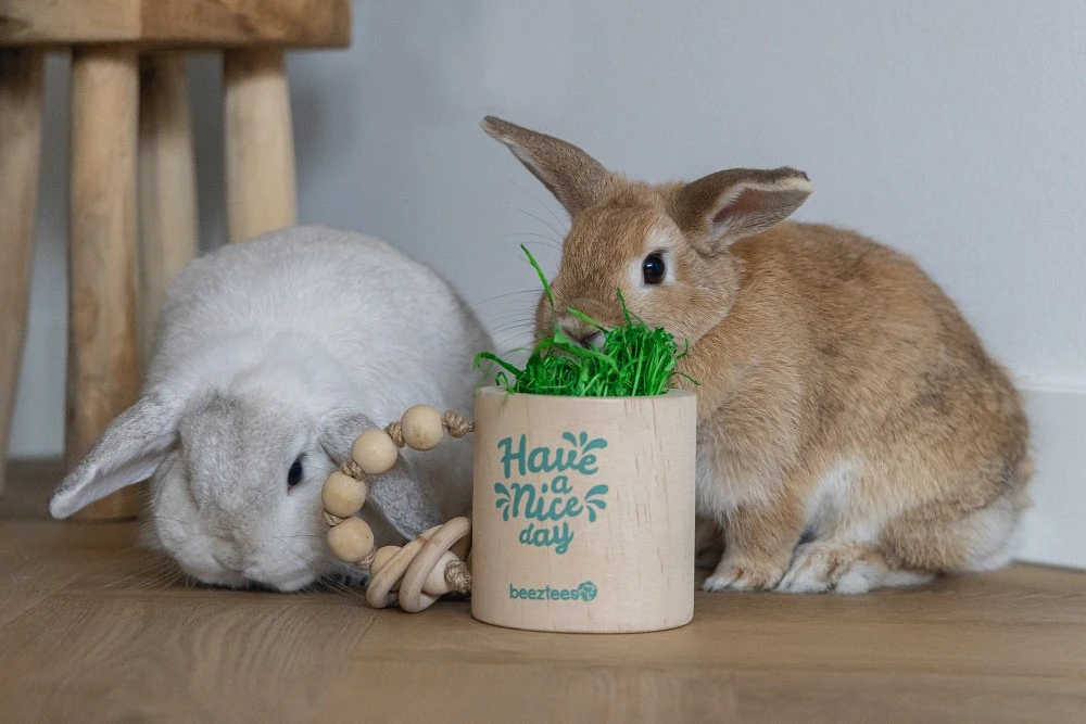 Wanneer de vulling uit de beker gehaald is, kan je deze vullen met heerlijk vers hooi. Zo kan je het konijnenspeelgoed ook gebruiken als natuurlijke hooiruif.
