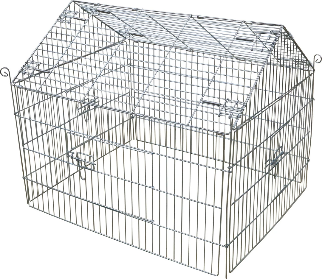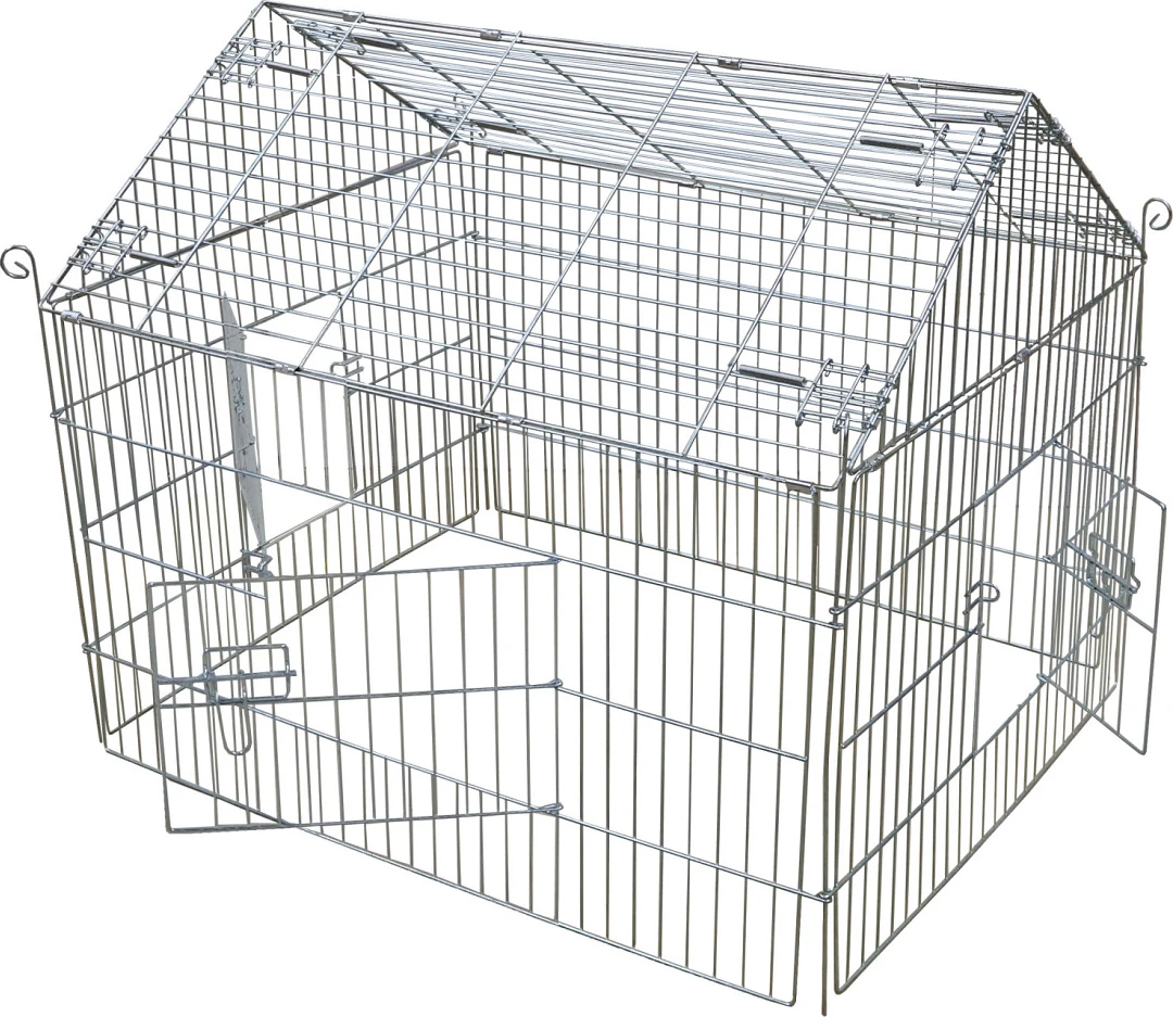 Draadren in de vorm van een huis, voor konijnen en cavia’s. Kan op gras of op een harde ondergrond geplaatst worden. Afm. 90 x 75 x 75 cm.