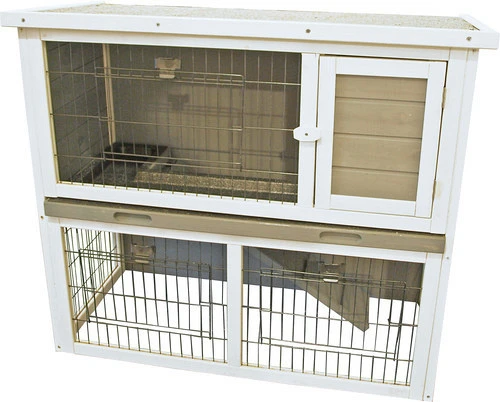 Dit wit met grijze houten konijnenhok met ren (twee etages) wordt als bouwpakket geleverd en is eenvoudig te monteren. Het konijnenhok heeft een plastic lade en een nachthok.