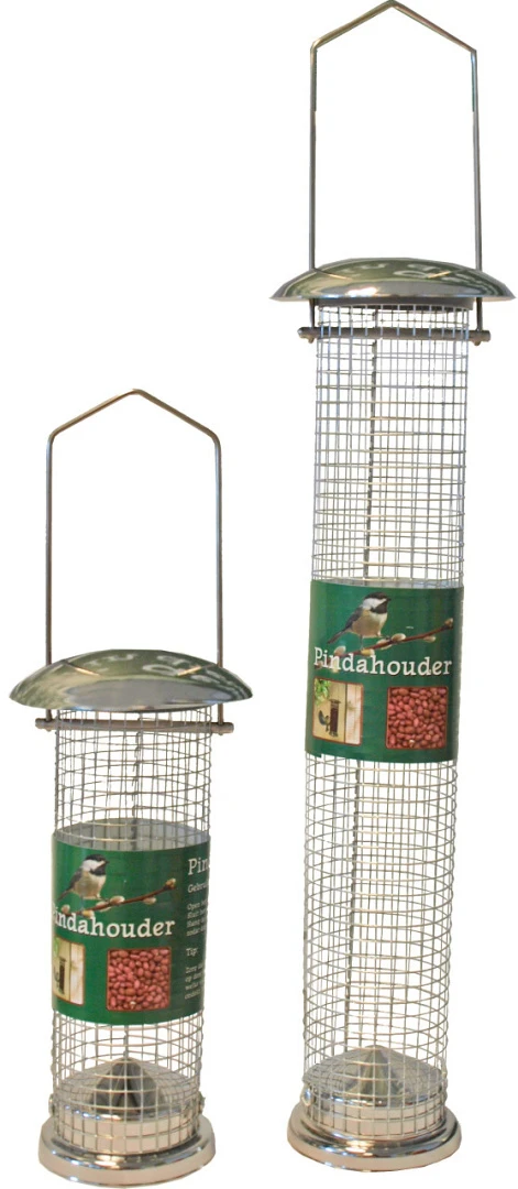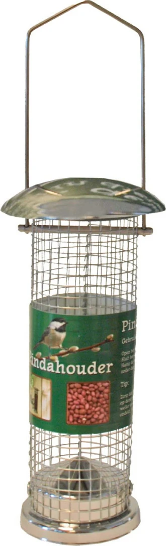 Metalen pindahouder voor pinda’s. Pinda’s zijn een eiwitrijke en vetrijke voeding die door vele vogels graag gegeten wordt. Om ‘pindarovers’ zoals gaaien geen kans te geven en het voer langer vers te houden is deze pindahouder een uitkomst.