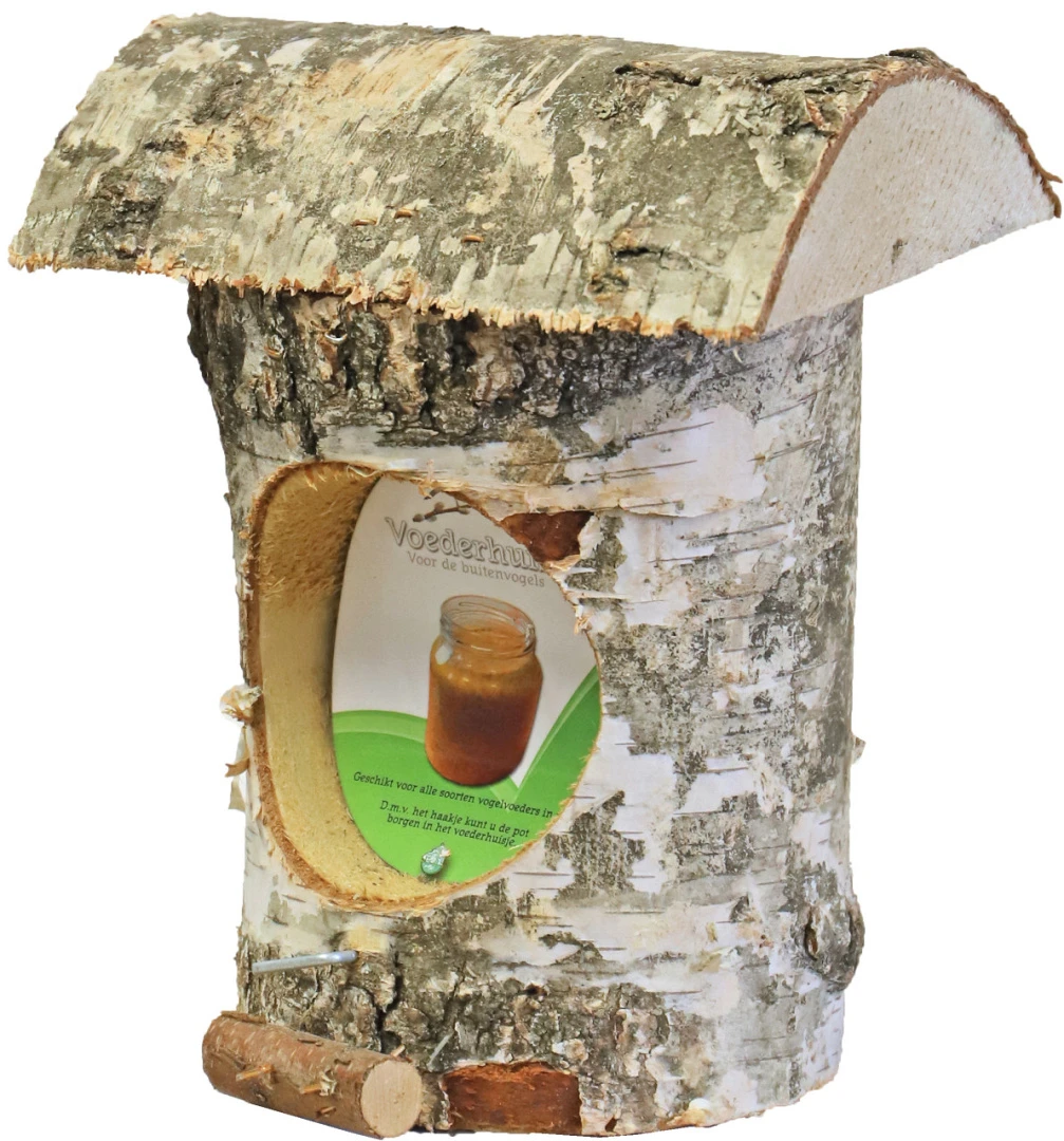 Met de pindakaaspothouder berken met berken dak kun je een pot vogelpindakaas voor buitenvogels heel gemakkelijk ophangen.