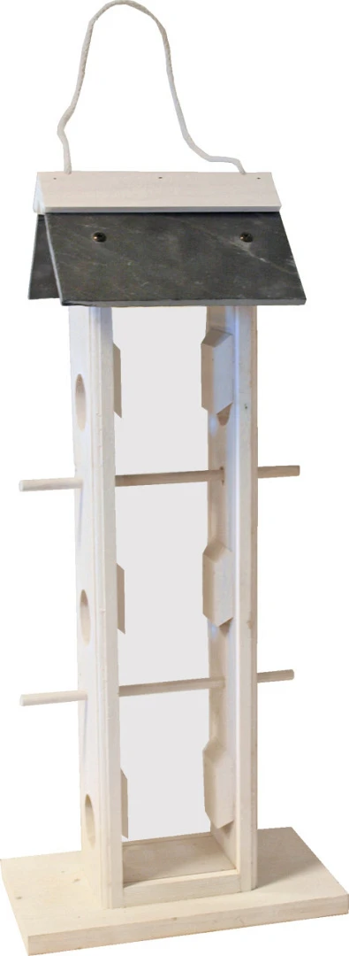 De voedersilo 6-gaats met puntdak is een mooie voedersilo die voor een mooie aankleding van jouw tuin zorgt. Deze witte voedersilo met een puntdak, afgewerkt met leisteen, is op te hangen aan een touw lus. Het is een ideale voederplek voor (kleine) vogels.