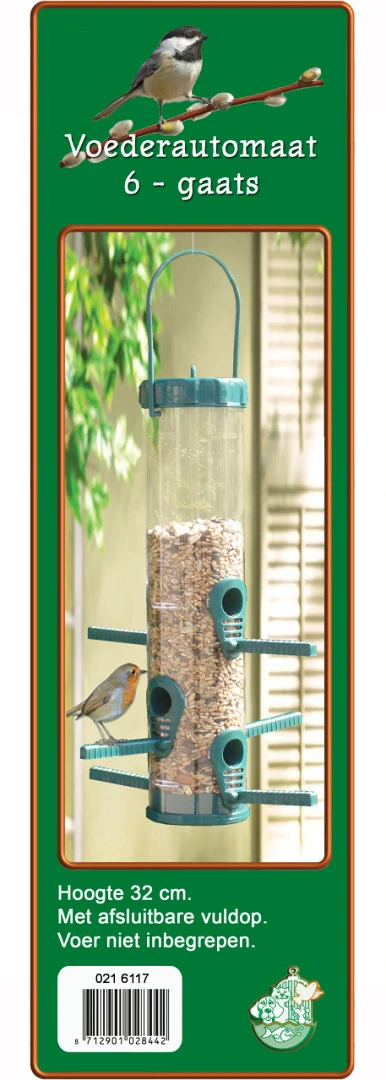De vogelvoederautomaat 6-gaats is een kunststof voedersilo met zes voederopeningen.