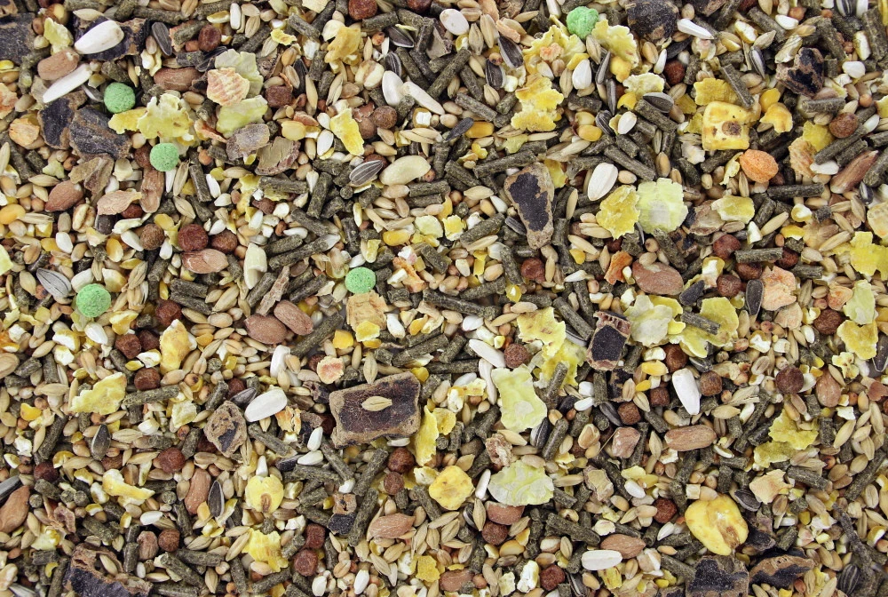 Samenstelling: [Graanuitmaal zwaar, grasbrokken, zonnepitten, havermoutmeel, palmpitschilfer, moutkiem, krijt, tarwegries, premix, melasse, kalksteentjes], tarwe, mais, johannesbrood, gerst, sorghum, haver, ontsloten mais, erwten, kardizaad, zonnepitten, ontsloten mais, erwtenvlokken, pinda’s gepeld, ontsloten wortel.Nutritionele toevoegingen per kg: Organische stof 170,98 gr, Jodium (E2) 0,30 mg, Selenium (E8) 0,04 mg, Vitamine A (E672) 8000 IE, Vitamine E 20 mg, Vitamine D3 (E671) 1000 IE, Zink (E6) 10 mg