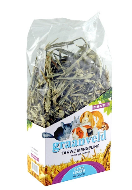 ESVE Graanveld Tarwemengeling komt direct van het land en bevat een hoog percentage natuurlijke vezels. Dit zorgt voor een goede spijsvertering bij knaagdieren en konijnen. Hoe beter de spijsvertering, des te meer het dit de gezondheid van jouw huisdier bevordert. Tarwemengeling is een verantwoord tussendoortje, en bevordert tevens de spijsvertering.