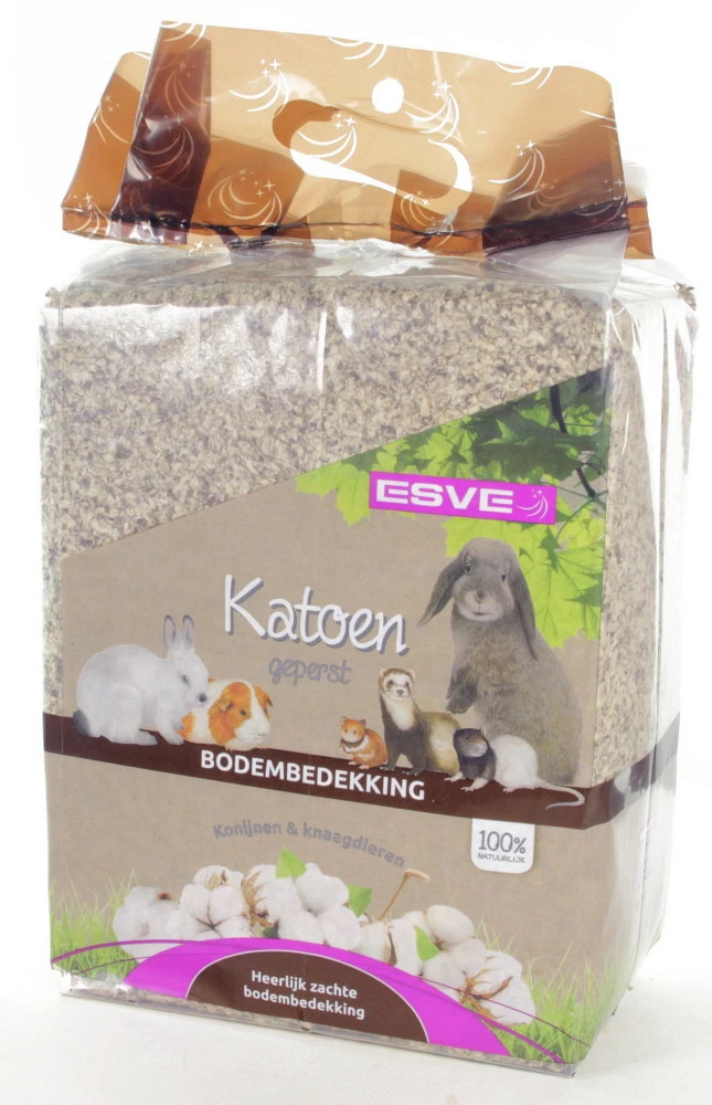 ESVE Katoen bodembedekking is een bodembedekking voor alle kleine huisdieren. Een 100% biologische bodembedekker voor hokken met knaagdieren en konijnen. Het product is op basis van katoenzaad vezel, dat vocht en geurtjes uitstekend absorbeert. Het hok blijft daardoor langer schoon, droog en vrij van geurtjes. Katoen ESVE is tevens stofvrij, dus uitstekend geschikt voor rat, muis en fret.