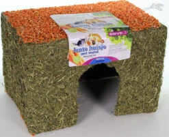 De huisjes zijn gemaakt van natuurlijke materialen en zorgen ervoor dat uw konijn of knaagdier zich niet meer hoeft te vervelen. Het huis is bedekt met graszaden, hooi en een dak van wortel.