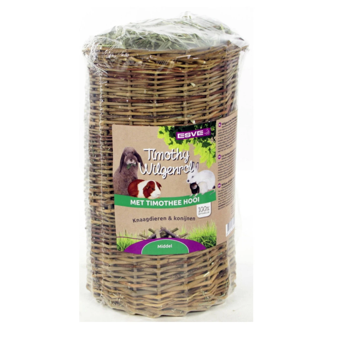 ESVE Wilgenrol Timothy is de ideale combinatie tussen een knaag- en speelplaats voor jouw konijn, cavia, chinchilla of rat of fret. 100% natuurlijk rol van wilgenhout volledig gevuld met timothee hooi. Een zeer smakelijke hooisoort met een hoog gehalte voedingsvezels.