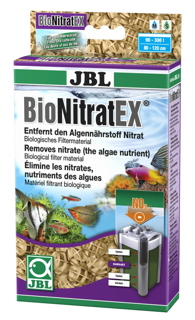 JBL BioNitratEx werkt op zuiver biologische wijze door een bacterile nitraatafbraak. JBL NitratEx daarentegen is een kunsthars dat nitraat uit het water bindt (alleen in zoetwater!) en omruilt tegen onschuldig chloride (ionen uitwisseling). Het voordeel van dit systeem is dat het ook snel ingezet kan worden bijv. om nitraat uit leidingwater of grondwater te verwijderen.