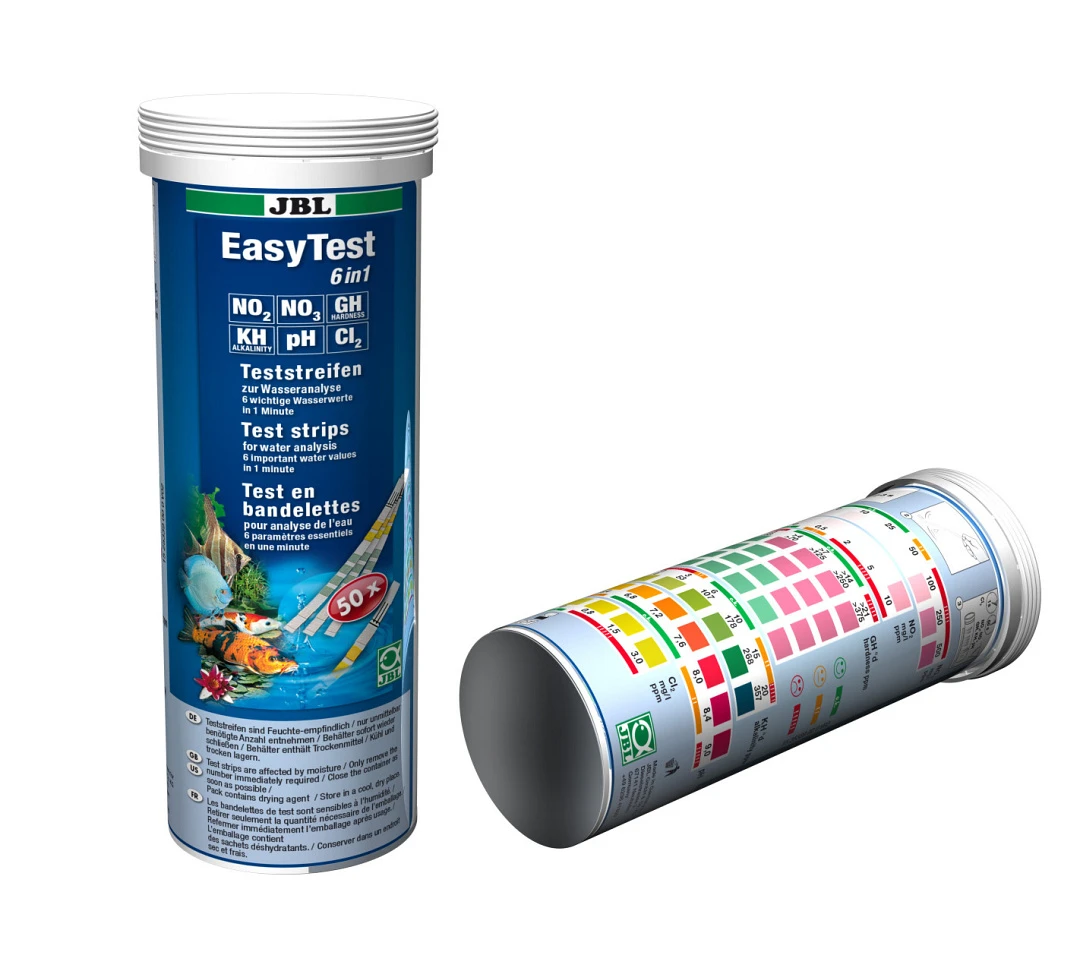 De EasyTest 6-in-1 van JBL helpt je eenvoudig en snel de zes belangrijkste waarden van het water van jouw aquarium of vijver te bepalen. De waarden van chloor, nitraat (NO3) en nitriet (NO2) geven aan of de biologische reinigingsprocessen goed functioneren.