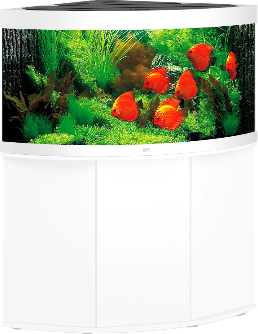 Prachtig hoekaquarium met indrukwekkende dieptewerking. Incl. filter, verlichting en verwarmingselement. Afm. 123 x 87 x 65 cm. Exclusief meubel.