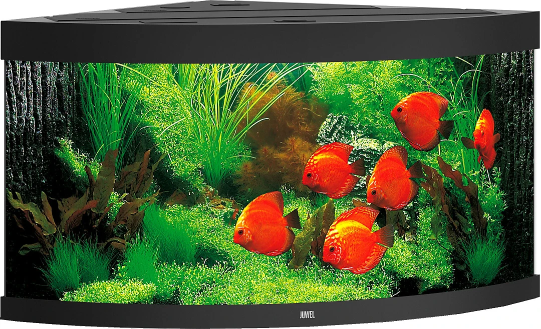 Prachtig hoekaquarium met indrukwekkende dieptewerking. Incl. filter, verlichting en verwarmingselement. Afm. 123 x 87 x 65 cm. Exclusief meubel.