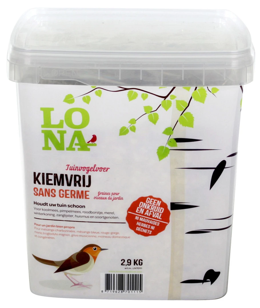 Lona kiemvrij tuinvogelvoer houdt je tuin schoon. Voor koolmees, pimpelmees, roodborstje, merel, winterkoning, zanglijster, huismus en soortgenoten.