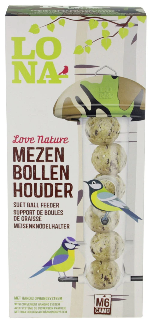 Mezenbollenhouder met drie voederunits. Eenvoudig te bevestigen aan muur of schutting. Geschikt voor zes mezenbollen.