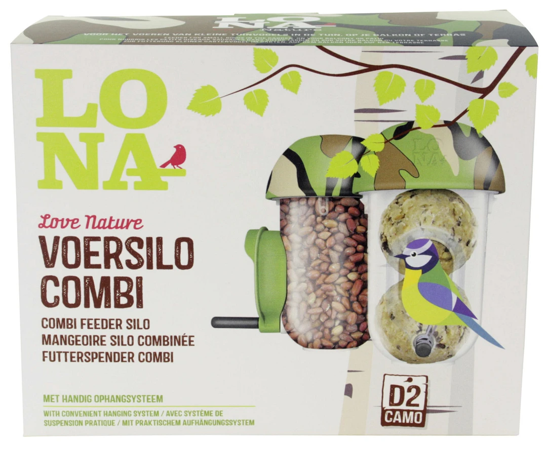 Lona D2 voersilo combi is een voersilo én een mezenbollensilo voor het voeren van tuinvogels. Eenvoudig te bevestigen aan een regenpijp, boomstam, tak, schutting, muur of pergola.