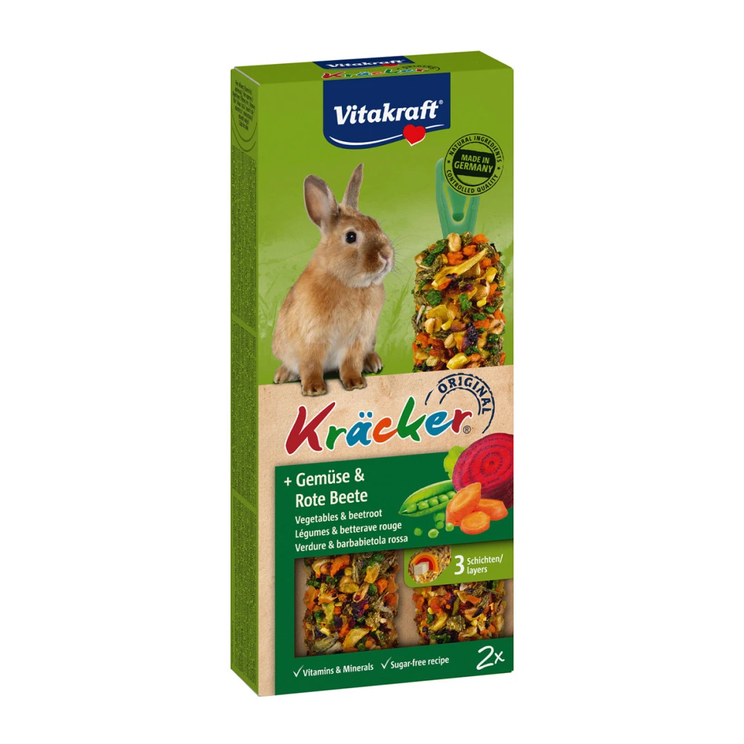 Vitakraft Kräcker Original konijn met groente en bieten is een verantwoorde lekkernij en bevat lekkere granen, groente en bieten op een natuurlijk knabbelhoutje.